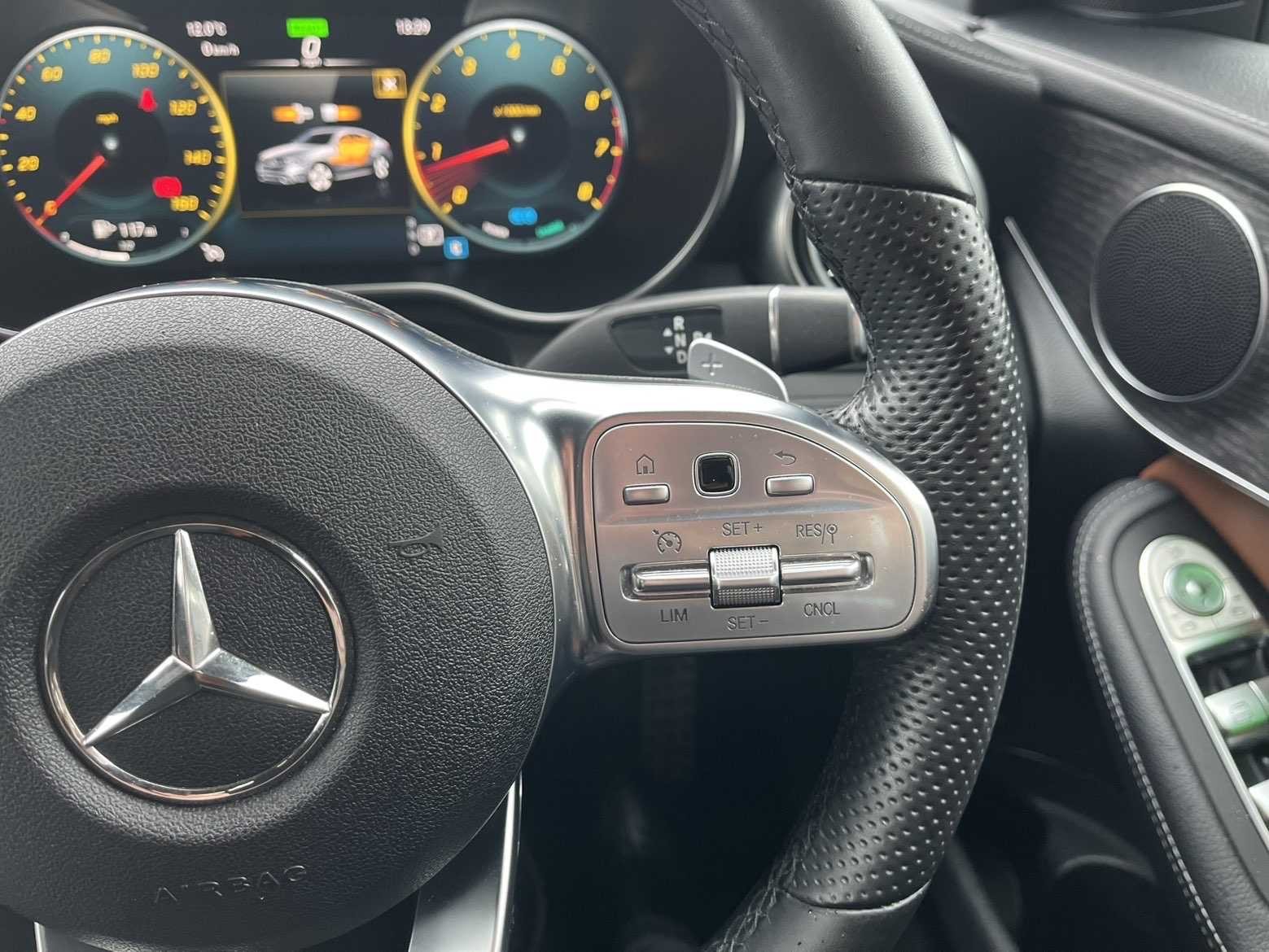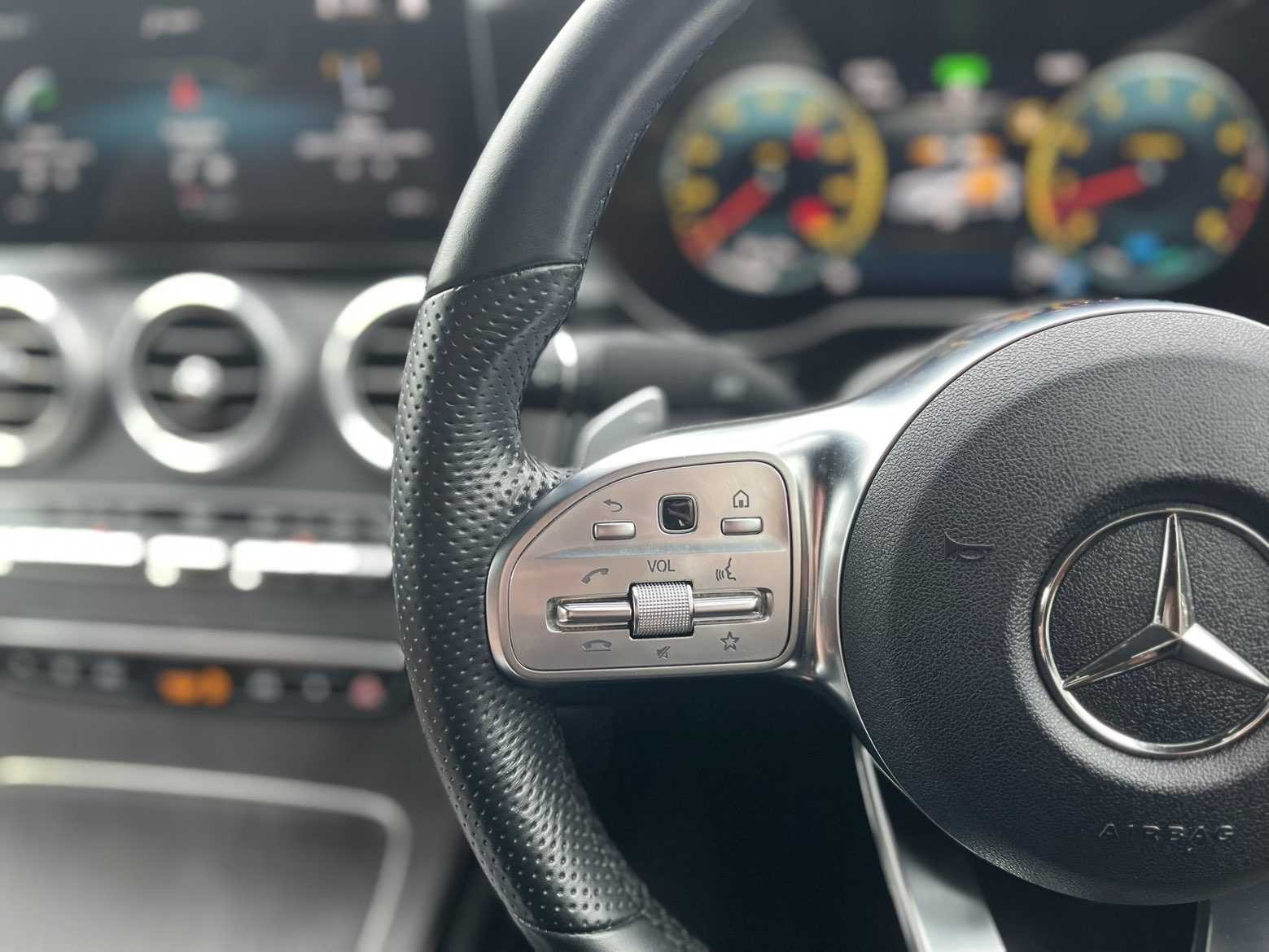 - 3-spoke multifunction sport AMG steering wheel in black nappa leather with flattened bottom section, chrome insert and perforated leather in grip area