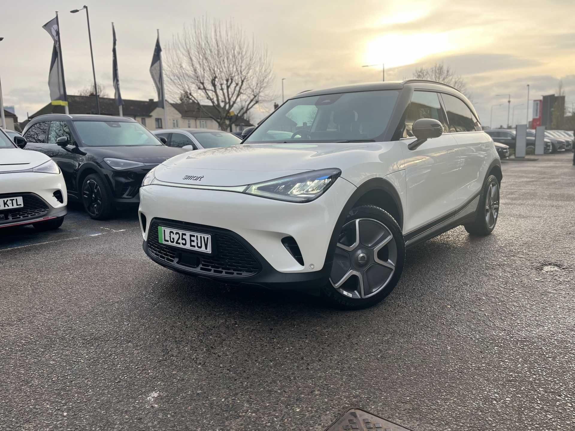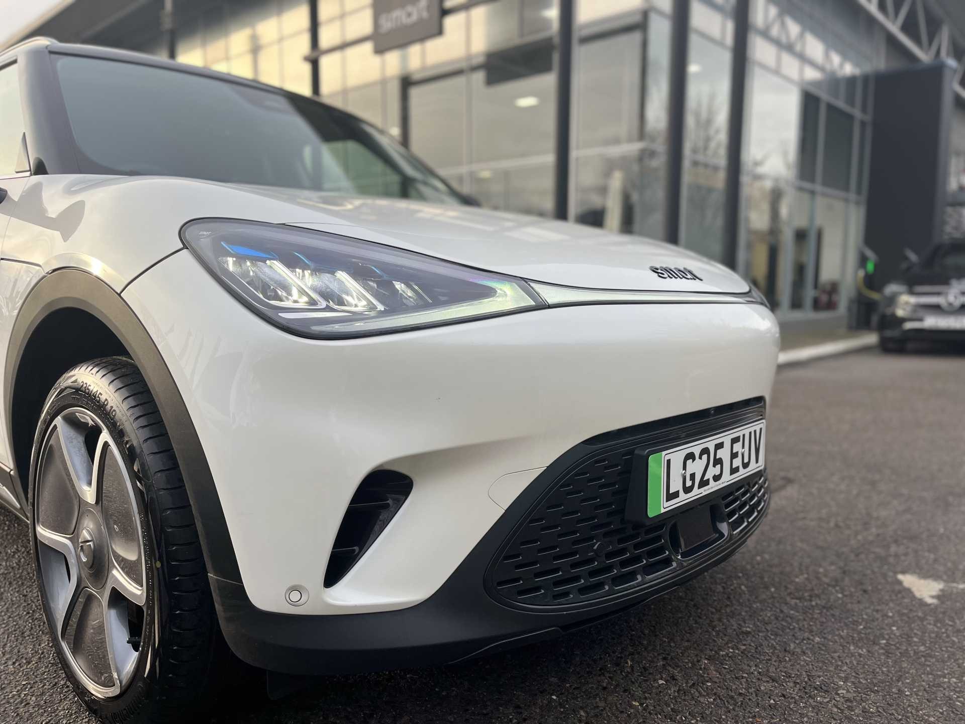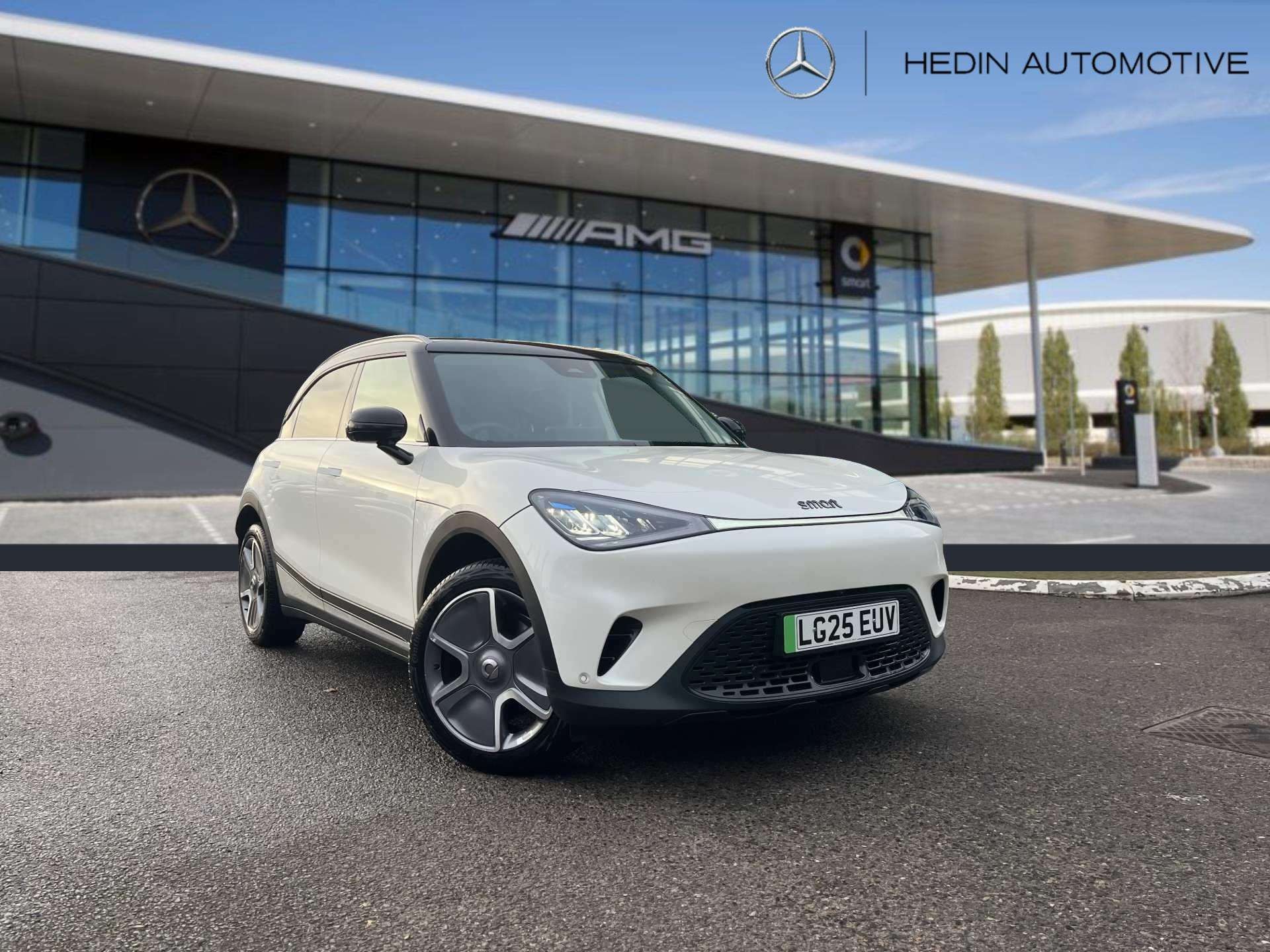 This is a 2025 Smart #1 After Dark, finished in white, with 1,936 miles on the clock. It is an all-electric SUV with a 200 kW power output and an automatic transmission, and features a four-wheel drive system for added traction and stability.